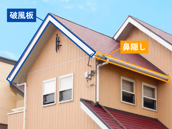破風板は屋根の妻側(三角になっている側面)に取り付けられるのに対し、鼻隠しは軒先側、つまり屋根が前後に飛び出している部分の先端に取り付けられます。雨どいが取り付けられている板、と言えばイメージしやすいかもしれません。