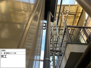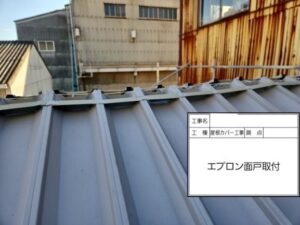 さらに、エプロン面戸と呼ばれる部材を追加設置し、風雨による逆流や隙間からの雨水侵入のリスクをしっかりブロックしました。耐風・耐雨性能を高める上での大切な仕上げ工程です。