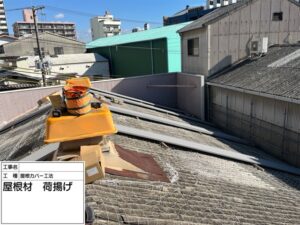 今回の現場の屋根は、既存の大波スレート屋根が経年劣化により非常にもろくなっていました。そのため、作業中に屋根材が割れたり落下したりする危険性があるため、屋根全面に落下防止ネットを設置しました。