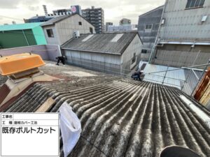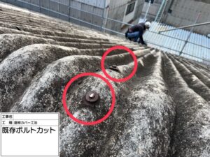 既存の屋根を固定している突出したボルトを全てカットします。これは新しい屋根材が干渉しないようにするための処理であり、平らな施工面を確保することで、ガルバリウム鋼板の安全な仕上がりに繋がります。