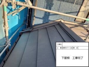 今回採用いただいたのは、アイジー工業の「スーパーガルテクト(シェードチャコール)」です。高耐久・軽量設計により、建物への負担を軽減しながら耐震性の向上も期待できます。また、下葺き材には「モラサン」を使用し、防水性能もしっかり確保しております。