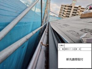 唐草は、屋根先端から雨水を適切に雨樋へ導く役割があります。ここが正しく施工されていないと、雨水が逆流したり、屋根内部へ回り込む恐れがあります。
