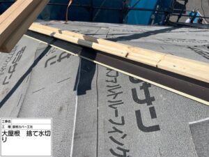 続いて棟木を取り付け、さらに捨て水切りを設置します。