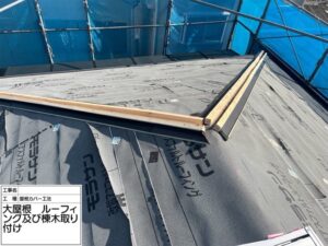板金撤去後、棟部分に新しいルーフィング(防水シート)を施工します。